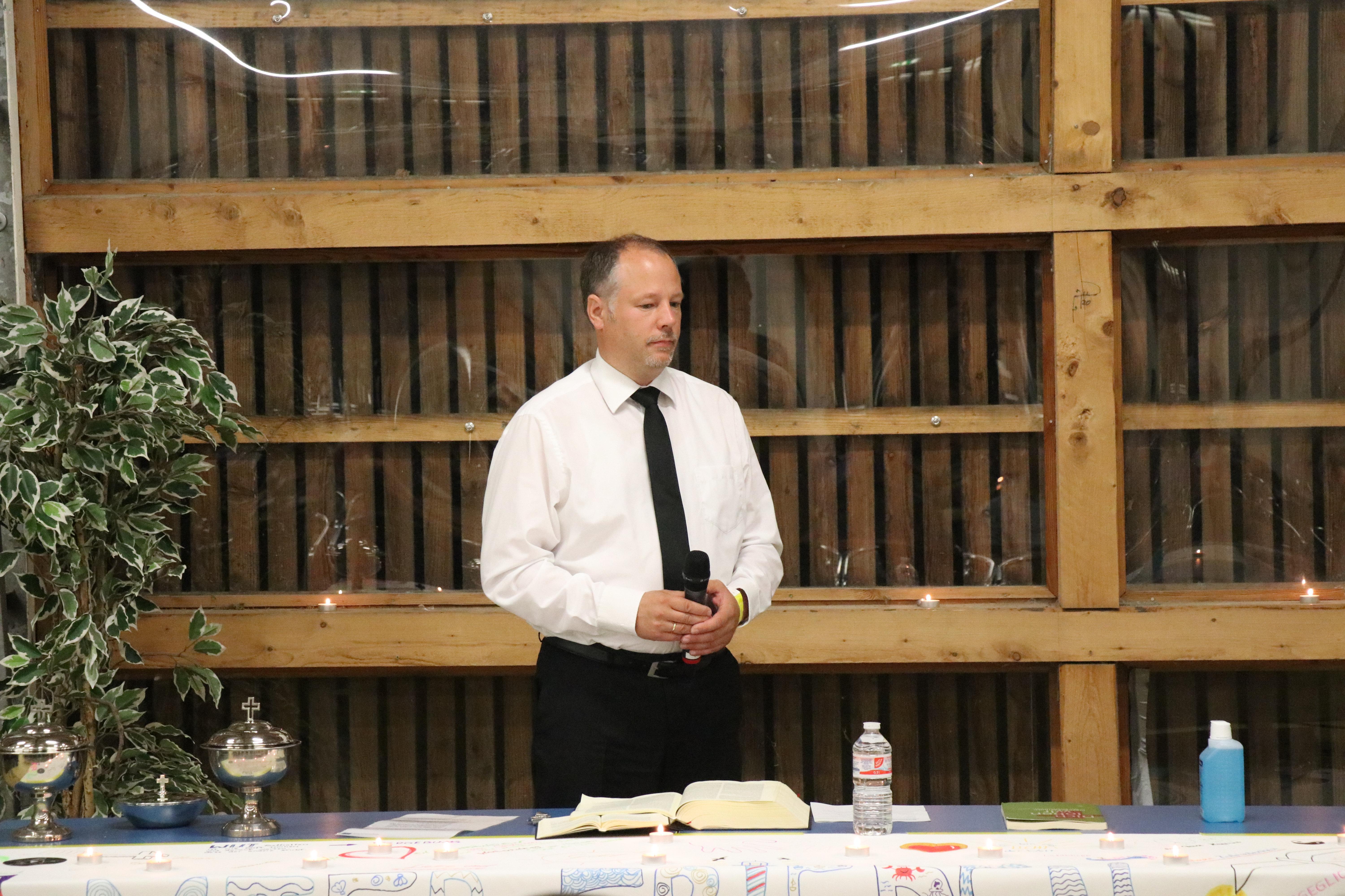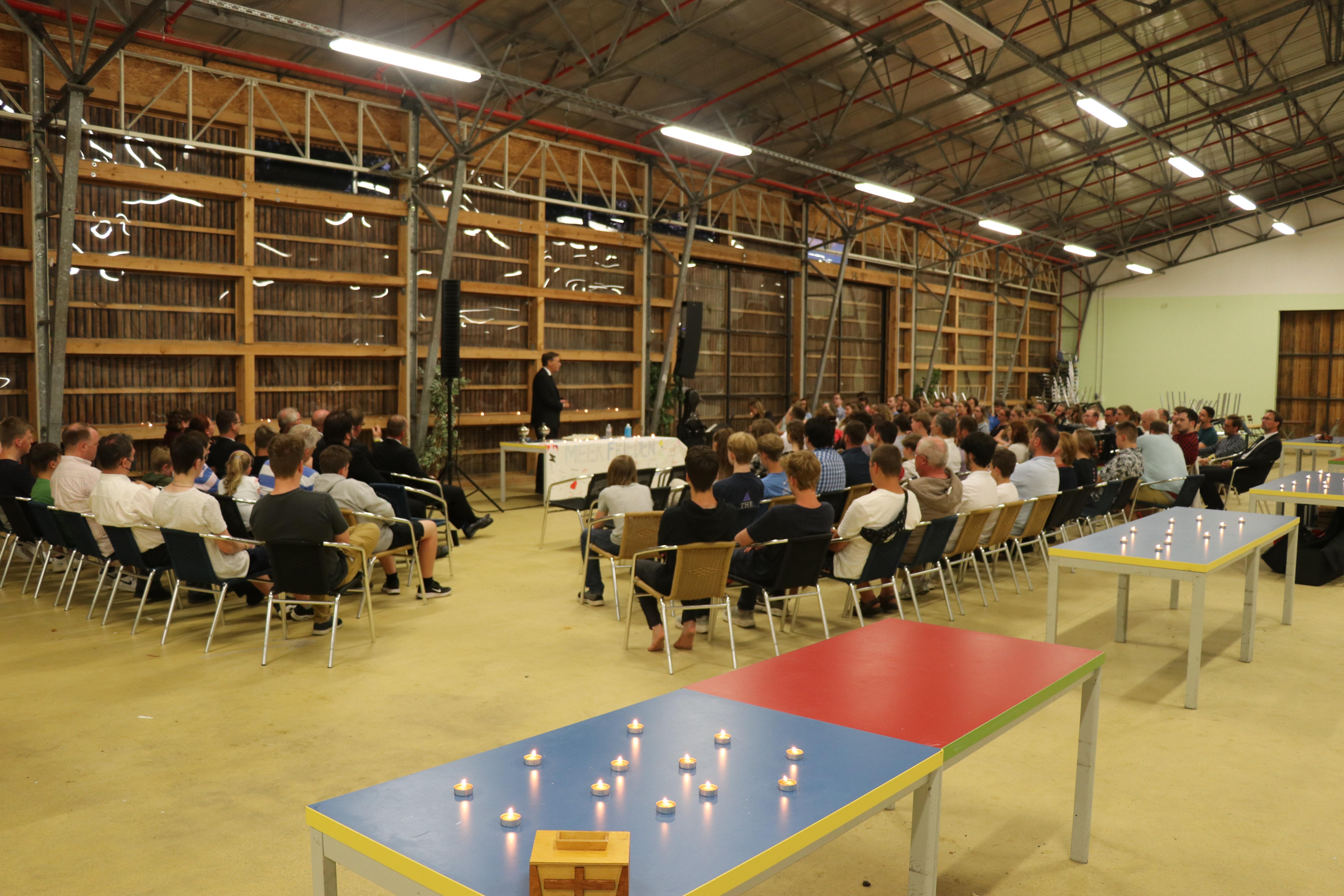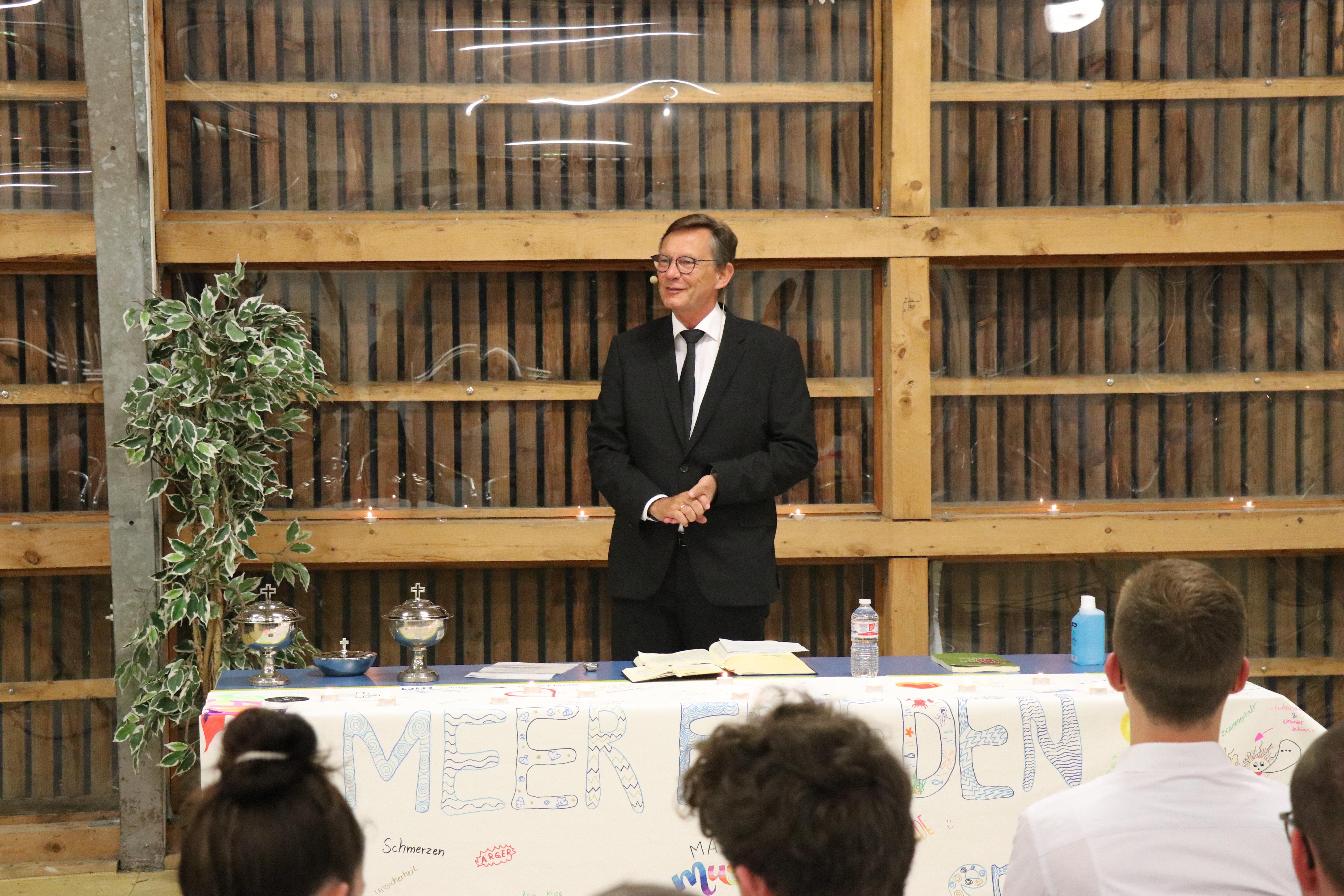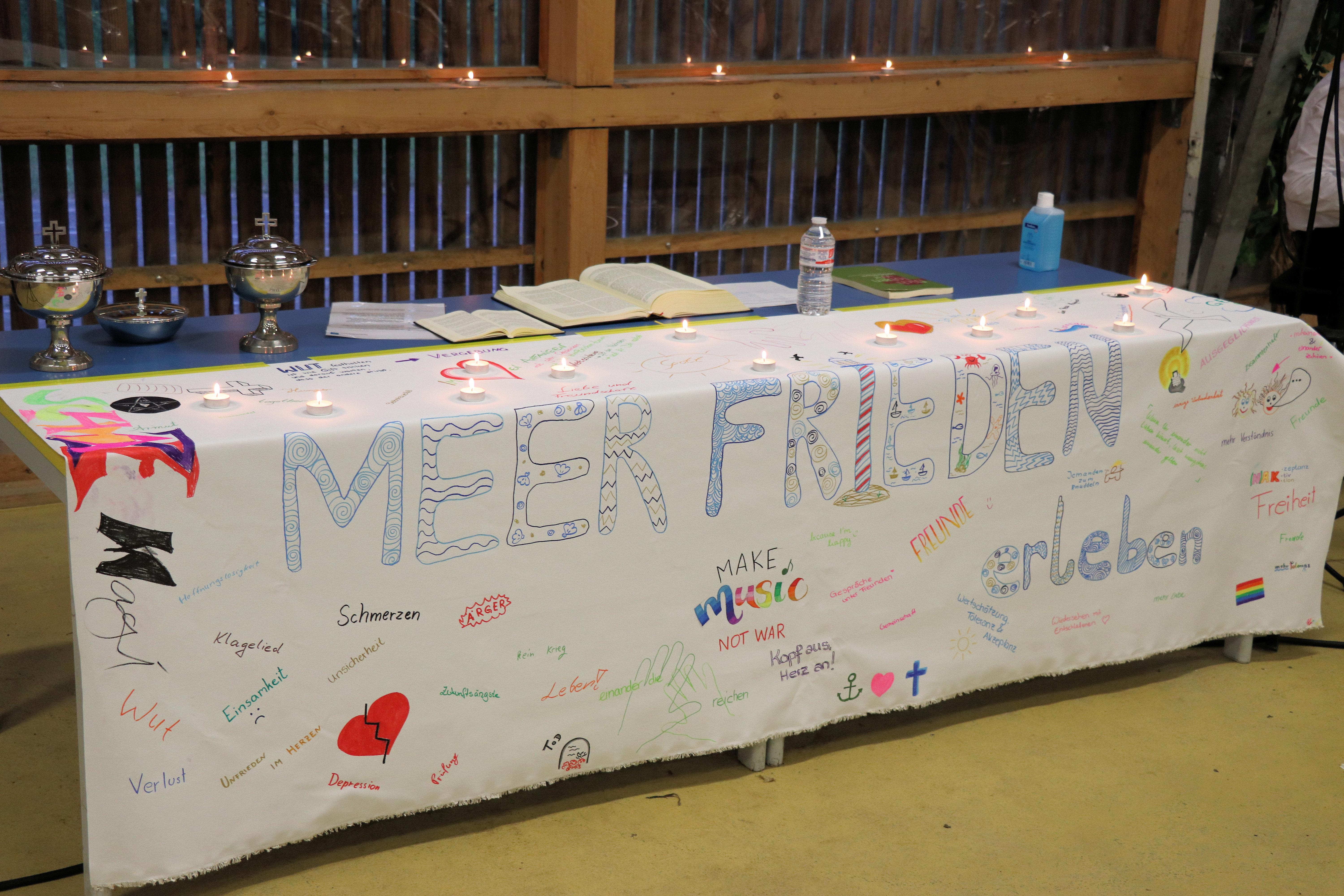 Am Samstagabend fand um 22 Uhr der Jugendgottesdienst auf dem Gelände der Jugendherberge statt. Der Gottesdienst wurde inhaltlich in Form eines Workshops vorbereitet. Neben Apostel Steinbrenner war auch Bischof Novicic anwesend. Der Apostel wählte als Grundlage für seine Predigt das Bibelwort aus Johannes 16 Vers 33 "Dies habe ich mit euch geredet, damit ihr in mir Frieden habt. In der Welt habt ihr Angst; aber seid getrost, ich habe die Welt überwunden.". In einer besonderen Atmosphäre erlebten die rund 140 jugendlichen Christen den Gottesdienst am späten Abend. Der Apostel griff in seiner Predigt viele Gedanken, Sorgen aber auch Dank der Jugendlichen auf. Dazu haben die Jugendlichen über das gesamte Wochenende kreativ ein Banner gestaltet welches im Gottesdienst den Altar schmückte.