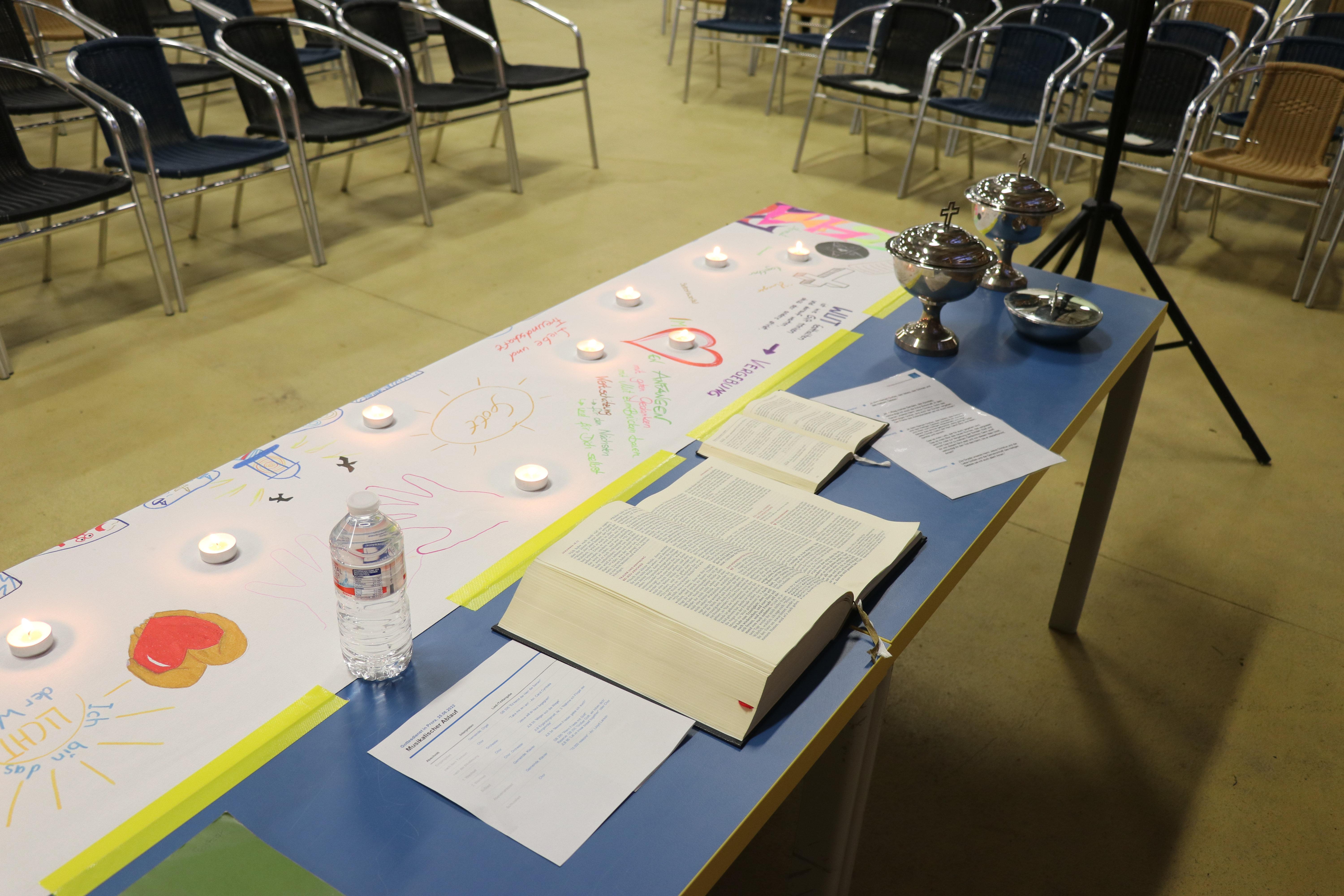 Am Samstagabend fand um 22 Uhr der Jugendgottesdienst auf dem Gelände der Jugendherberge statt. Der Gottesdienst wurde inhaltlich in Form eines Workshops vorbereitet. Neben Apostel Steinbrenner war auch Bischof Novicic anwesend. Der Apostel wählte als Grundlage für seine Predigt das Bibelwort aus Johannes 16 Vers 33 "Dies habe ich mit euch geredet, damit ihr in mir Frieden habt. In der Welt habt ihr Angst; aber seid getrost, ich habe die Welt überwunden.". In einer besonderen Atmosphäre erlebten die rund 140 jugendlichen Christen den Gottesdienst am späten Abend. Der Apostel griff in seiner Predigt viele Gedanken, Sorgen aber auch Dank der Jugendlichen auf. Dazu haben die Jugendlichen über das gesamte Wochenende kreativ ein Banner gestaltet welches im Gottesdienst den Altar schmückte.